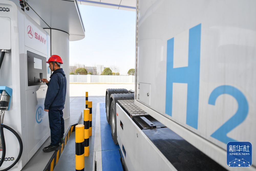 ↑3月20日,在长沙经开区的三一绿电制氢加氢一体站,工作人员在调试加氢设备。