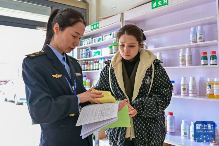 在新疆阿克苏市农资市场,阿克苏市农业综合行政执法大队的执法人员检查农资产品(3月21日摄)。