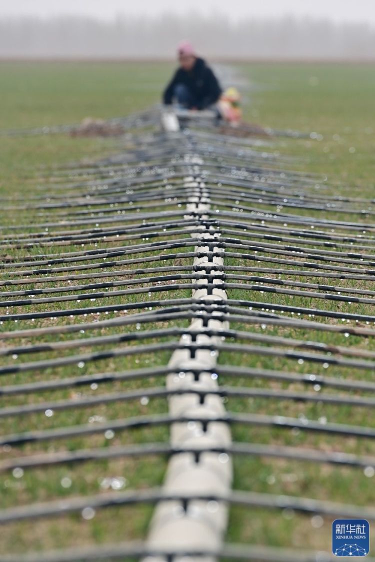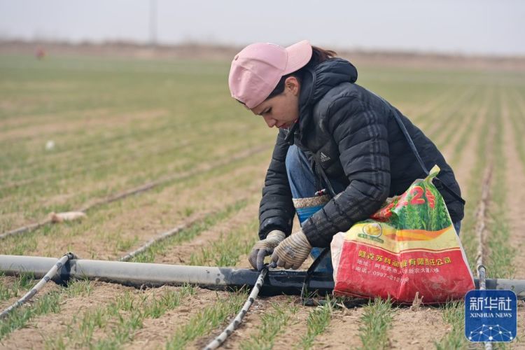 在新疆阿克苏市柳源镇瑞丰村,种植户在小麦地里检查滴灌系统(3月21日摄)。