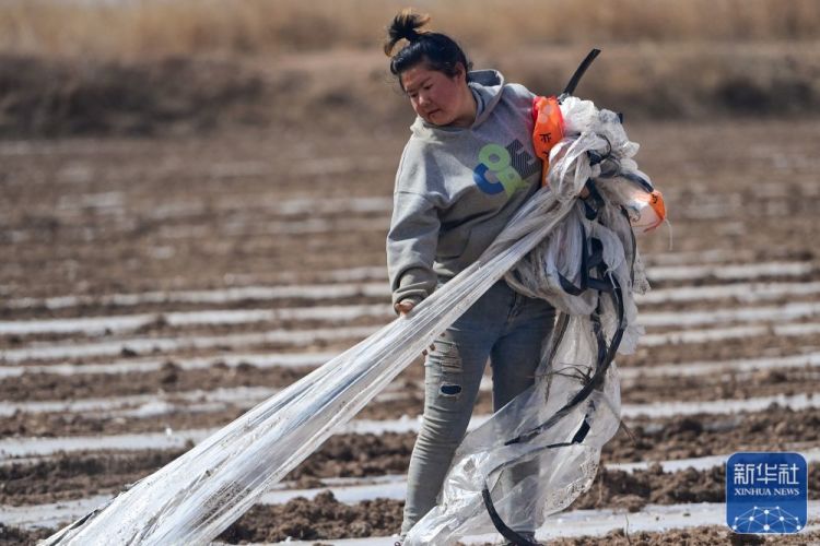 在新疆阿克苏市柳源镇天海村,农民回收多余的地膜和滴灌带(3月21日摄)。