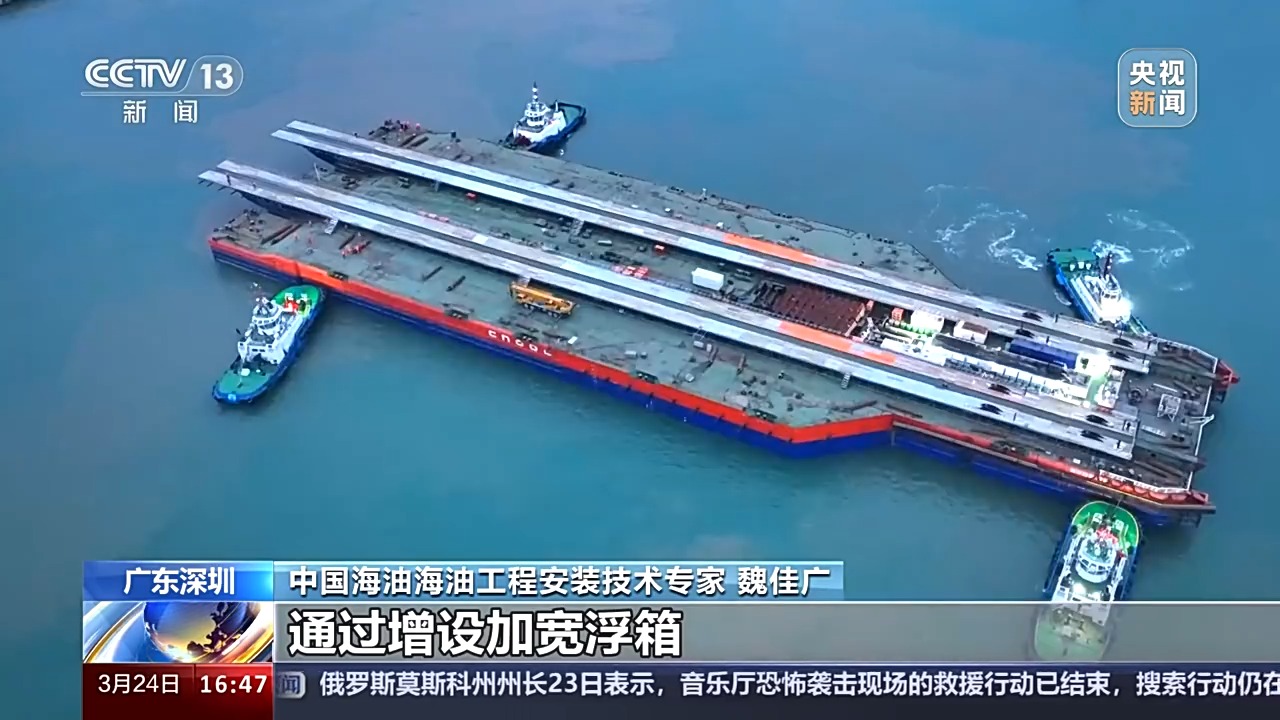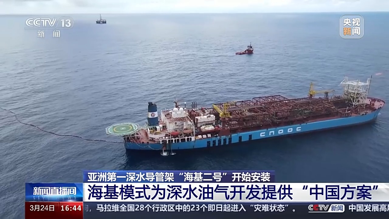 总台央视记者 古峻岭:这里是位于深圳东南方向240多公里处的流花油田海域,我们现在看到的这个大家伙,就是搭乘亚洲最大下水驳船——海洋石油229的海基二号深海导管架。它相当于海上平台稳稳矗立在海底的“大长腿”,用钢量接近于一整个“鸟巢”。它是从广东珠海出发,经过40多个小时的长距离拖航,刚刚抵达这一片施工海域。目前正在进行海上安装前最后的准备工作。