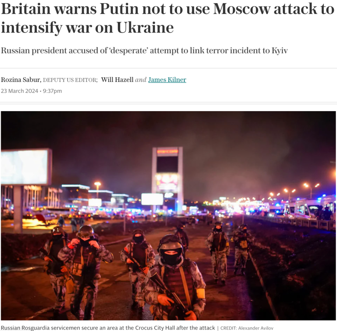 报道称,英国警告俄罗斯总统普京不要以在莫斯科发生的恐怖袭击作为“借口”,加大对乌克兰特别军事行动的打击力度。