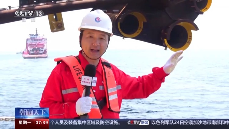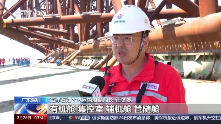 总台央视记者 古峻岭:登上这个海洋石油229运输船,给我的感受是真不愧是亚洲最大。我们可以看到这个甲板非常宽敞,而且长度特别长。我们再往中间看,纵横交错的导管架密密麻麻,置身在这里,就像是在一个遮天蔽日的钢铁森林中,它的总重量达到了37000多吨。