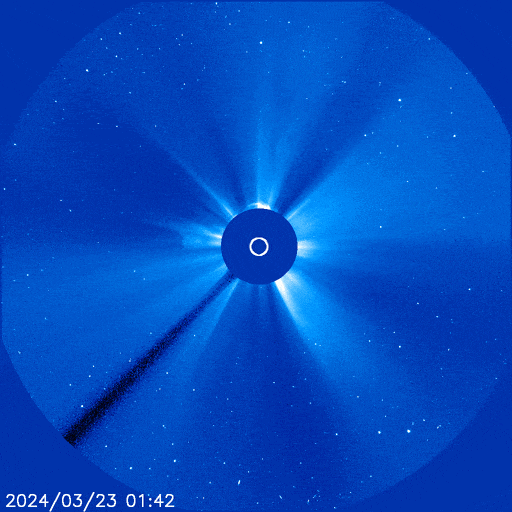 此次日冕物质抛射过程发生的位置几乎正对地球,因此从地球看去,喷发物形成一个圆面,也就是以往我们提到的“全晕”。此类爆发活动喷出的太阳物质相对地球速度快、覆盖度高,可能引起比较强的地磁活动。