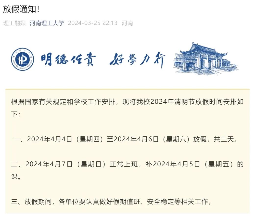 2024年4月4日至6日放假调休,共3天。4月7日(星期日)上班上课,上4月5日(星期五)的课。