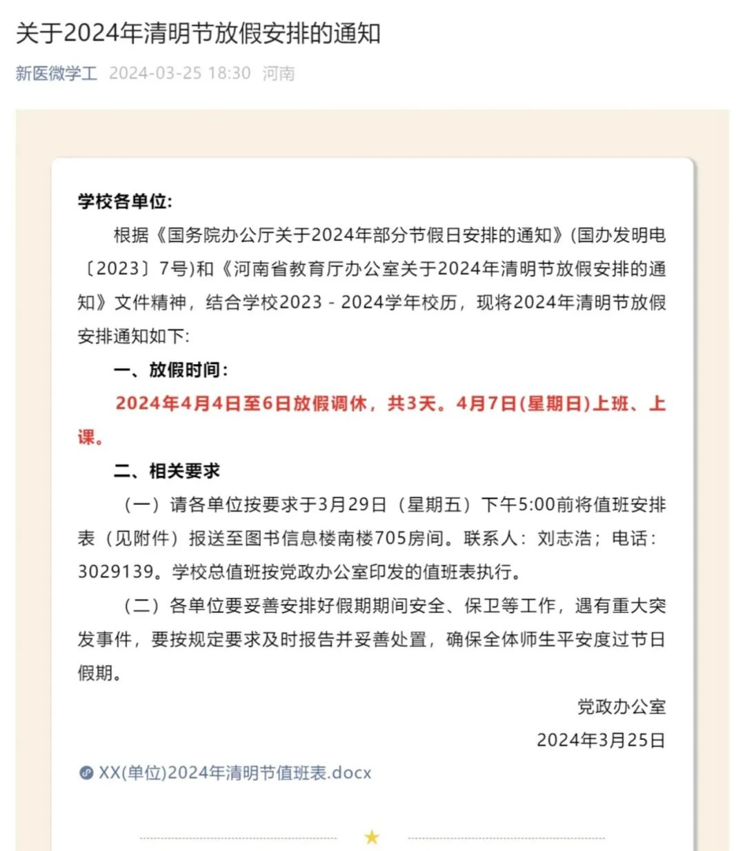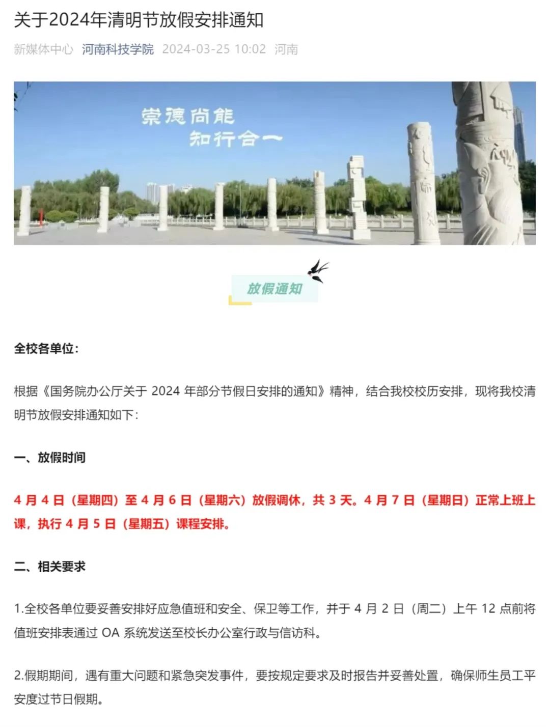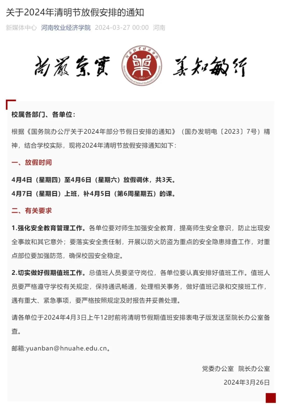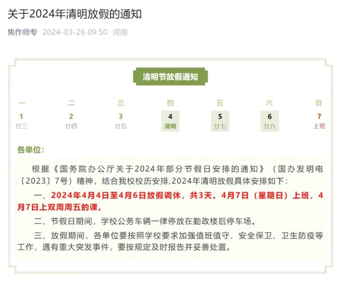 4 月 4 日(星期四)至 4 月 6 日(星期六)放假调休,共 3 天。4 月 7 日(星期日)正常上班上课,执行 4 月 5 日(星期五)课程安排。