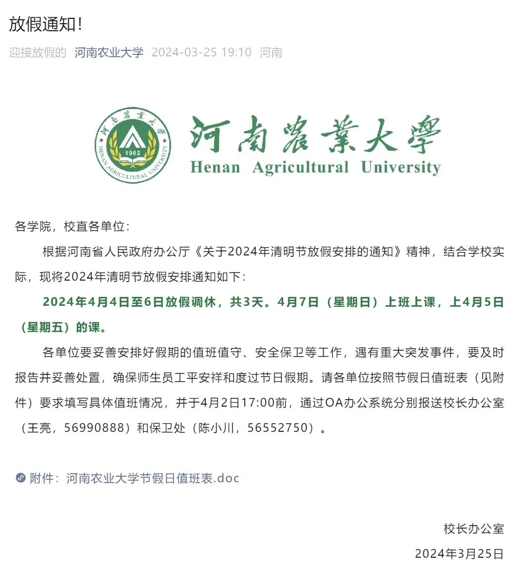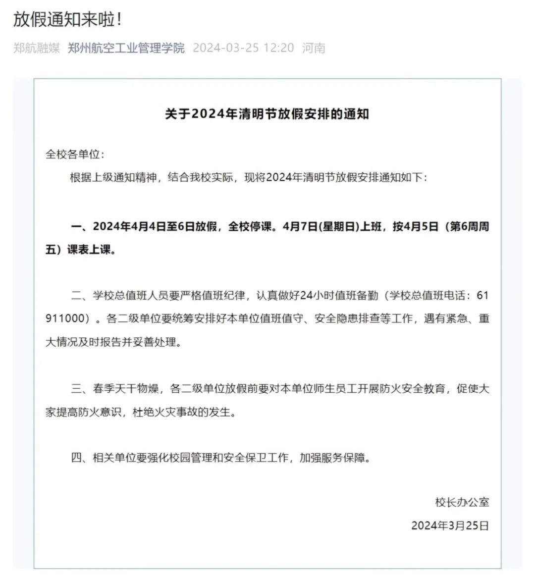 2024年4月4日至6日放假,全校停课。4月7日(星期日)上班,按4月5日(第6周周五)课表上课。