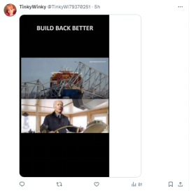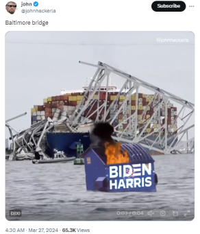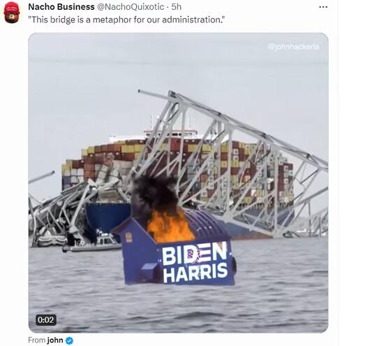 【环球网报道】美国马里兰州巴尔的摩一座桥梁当地时间26日凌晨因船只撞击坍塌,引发热议。对此,美国总统拜登当天晚些时候就该事件在社交平台X上发文向巴尔的摩市民表示,联邦政府会与其同在。不过,拜登此番表态似乎并没太让网友买账,而是引来不少美国网友发帖吐槽。