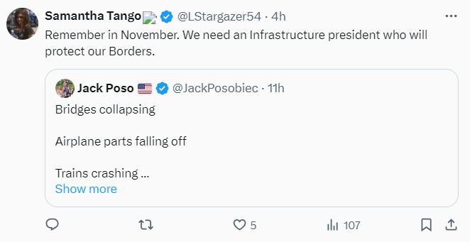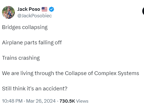 还有网友想到近日波音飞机屡发事故、此前美国火车出事故等,发文吐槽称,“桥梁坍塌,飞机零件脱落,火车相撞,我们正在经历复杂系统的崩溃,还认为这是偶然吗?”。对于这条评论,有网友回复称,“我们需要一位能保护边境的、(完善)基础设施的总统。”↓