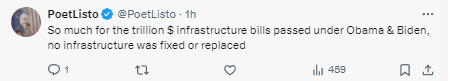对于此次货船撞塌大桥事件,在社交平台X上的其他相关帖文下方,有网友表示,“奥巴马和拜登通过了万亿美元的基础设施建设法案,(但)没有基础设施得到修复或更换。”↓