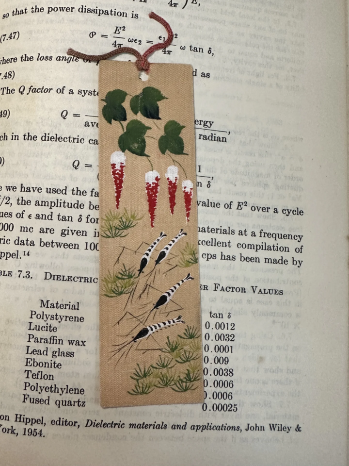原来,近日在浙江大学校内论坛上,赵文楷同学发帖称,自己在图书馆借书时意外发现了这张写于1957年的书签,书签被夹在1956年第二版《固体物理导论》英文书中,书签上竖排工整地写着“赠给好友 周净秋”几列小字,翻至书签的另一面,则绘有树叶、水草和河虾等景物,十分生动可爱。