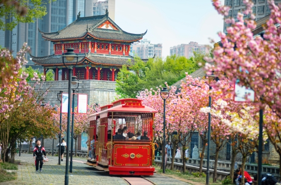 水城古镇樱花绽放,游客乘坐观光小火车游览美景。何育勇 摄