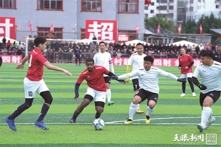 2月26日,在中法青年友谊赛,榕江村超联队球员与法国人民援助会队球员在比赛中拼抢。(图/云俊)