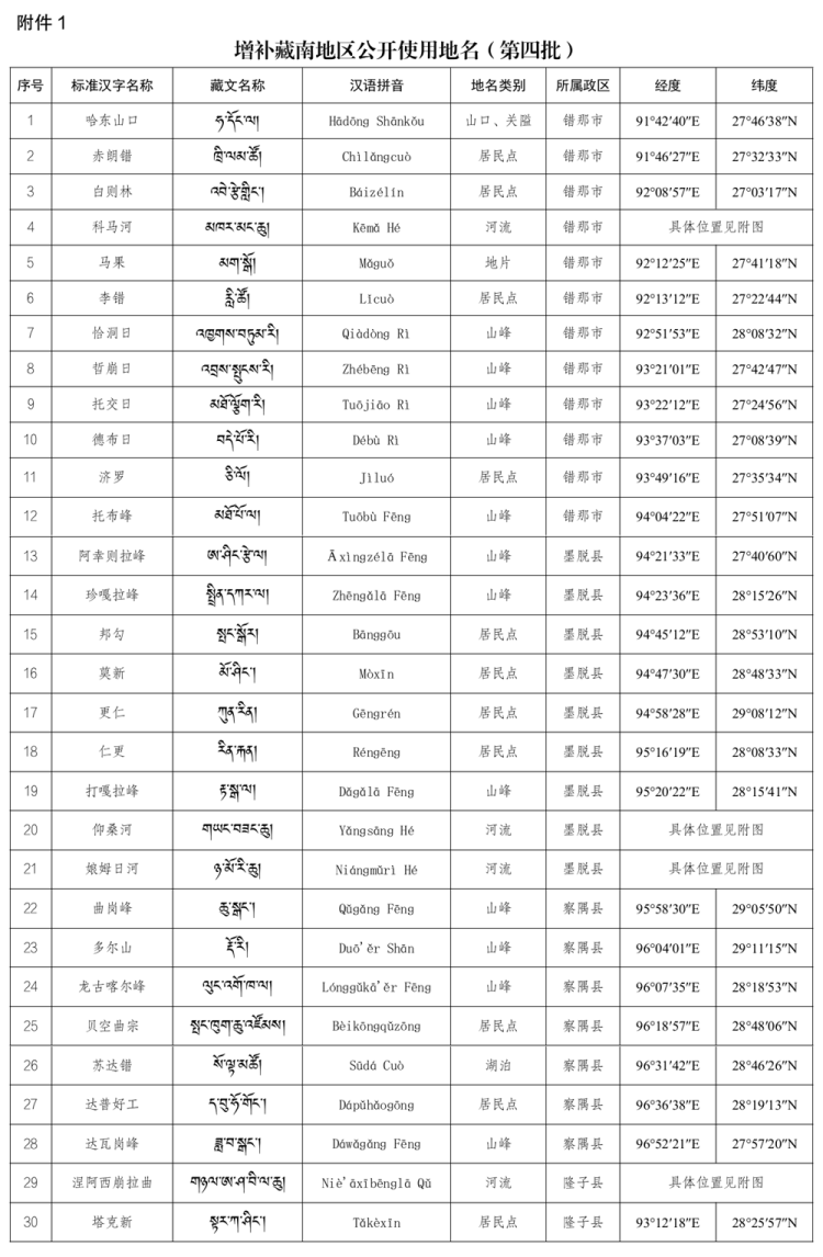 根据国务院地名管理的有关规定,我部会同有关部门对我国藏南地区部分地名进行了标准化处理。现正式公布第四批增补藏南地区公开使用地名(共30个)。