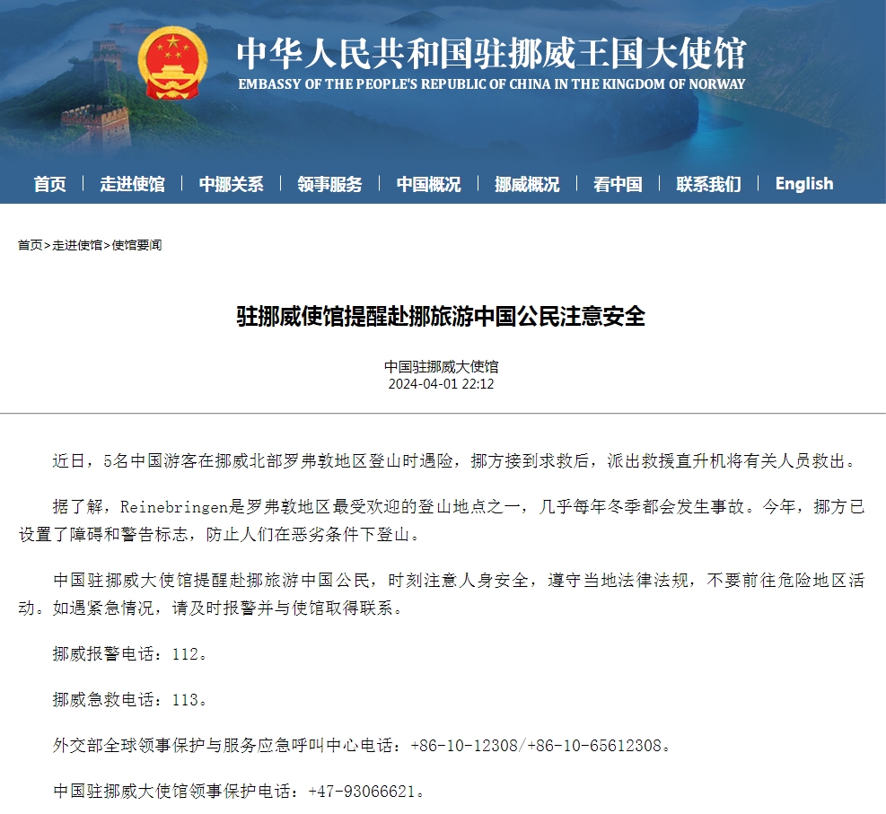 中国驻挪威大使馆提醒赴挪旅游中国公民,时刻注意人身安全,遵守当地法律法规,不要前往危险地区活动。如遇紧急情况,请及时报警并与使馆取得联系。