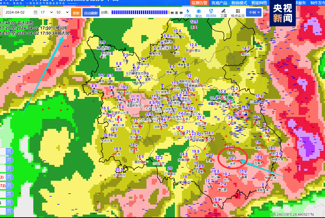 截至17时45分,国家站安义、进贤、南昌县反馈有冰雹出现;大风方面,南昌市平均阵风6级,13站超过7级,8站超过9级,极大阵风32.3m/s(11级),出现在进贤国家站。