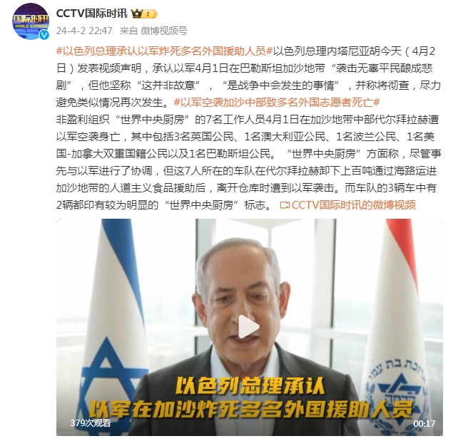 以色列总理内塔尼亚胡今天(4月2日)发表视频声明,承认以军4月1日在巴勒斯坦加沙地带“袭击无辜平民酿成悲剧”,但他坚称“这并非故意”,“是战争中会发生的事情”,并称将彻查,尽力避免类似情况再次发生。