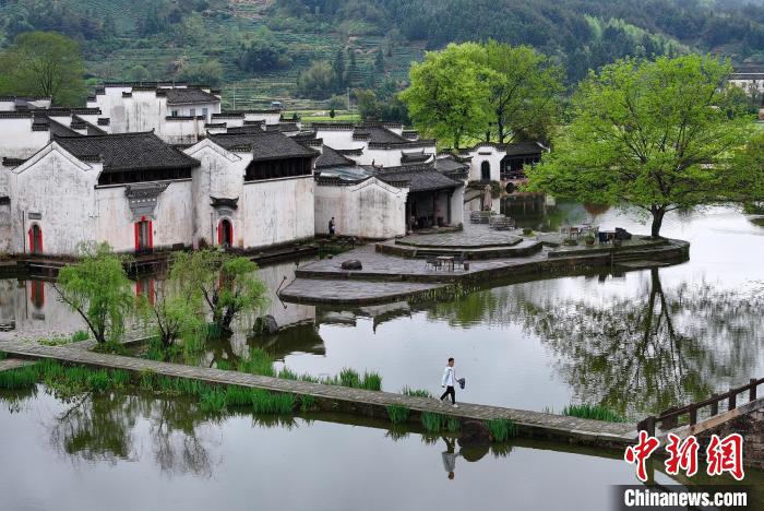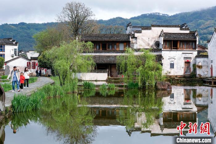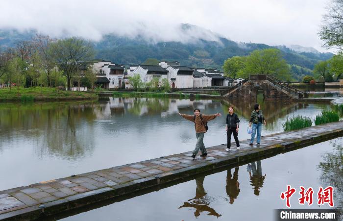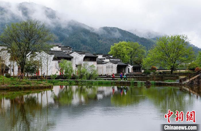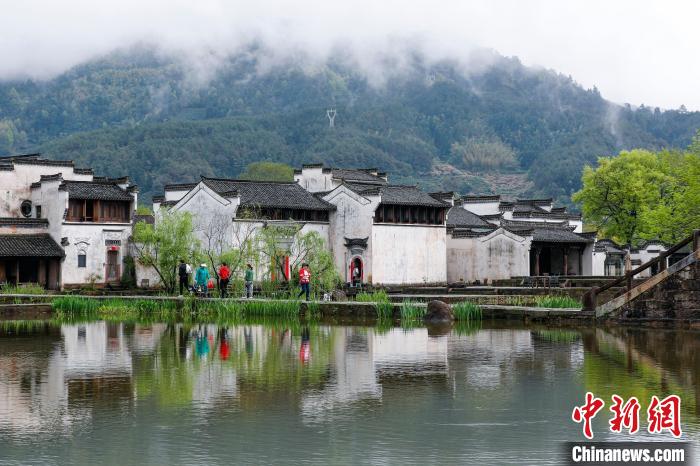 游客在安徽省黄山市徽州区呈坎古村欣赏烟雨美景。施亚磊 摄