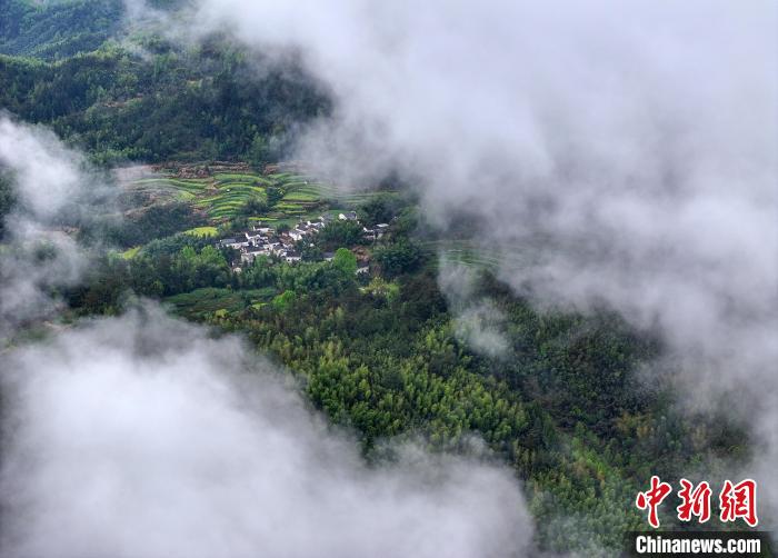 4月2日,安徽省黄山市徽州区呈坎古村烟雨朦胧,云海翻涌,风景如画。