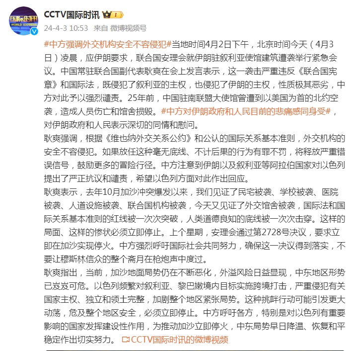 当地时间4月2日下午,北京时间今天(4月3日)凌晨,应伊朗要求,联合国安理会就伊朗驻叙利亚使馆建筑遭袭举行紧急会议。中国常驻联合国副代表耿爽在会上发言表示,这一袭击严重违反《联合国宪章》和国际法,既侵犯了叙利亚的主权,也侵犯了伊朗的主权,性质极其恶劣,中方对此予以强烈谴责。25年前,中国驻南联盟大使馆曾遭到以美国为首的北约空袭,造成人员伤亡和馆舍损毁。中方对伊朗政府和人民目前的悲痛感同身受,对伊朗政府和人民表示深切的同情和慰问。