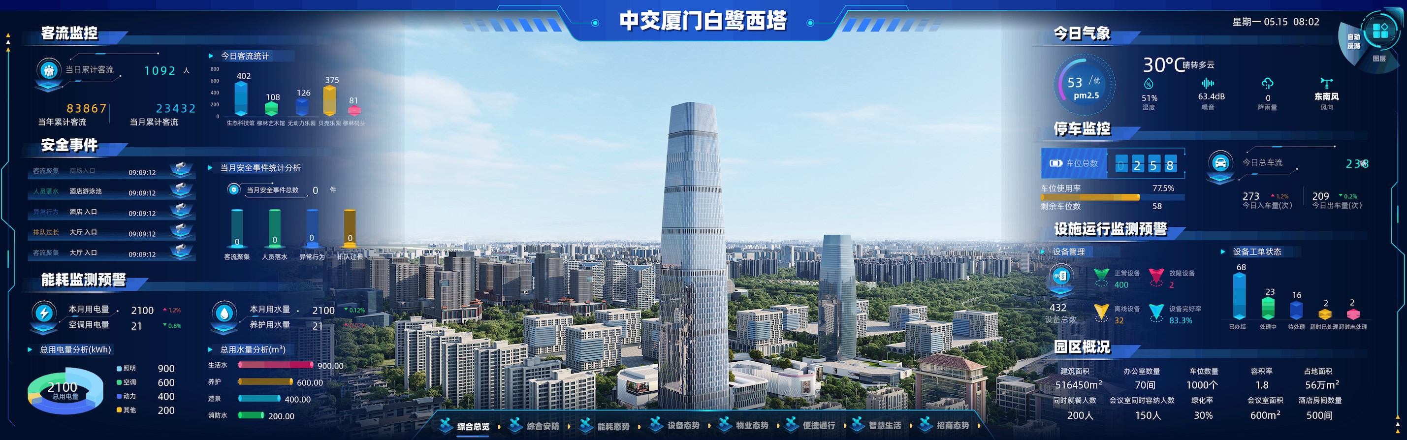 值得一提的是,中交白鹭西塔建设注重绿色建造、智慧建造,体现了中国交建的企业担当与社会责任。项目IOC智慧运维监控中心以数字孪生技术为核心,融合前沿科技,构建了智能化的运营管理体系,确保了运营的安全、便捷与高效。
