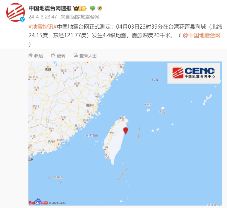 中国地震台网正式测定:04月03日23时39分在台湾花莲县海域(北纬24.15度,东经121.77度)发生4.4级地震,震源深度20千米。