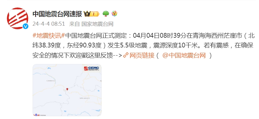 中国地震台网正式测定:04月04日08时39分在青海海西州茫崖市(北纬38.39度,东经90.93度)发生5.5级地震,震源深度10千米。