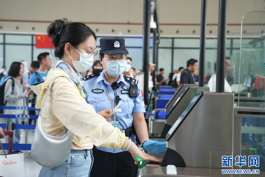磨憨站内,游客正通过快捷通道安检入站(4月3日摄)。新华网 刘云 摄