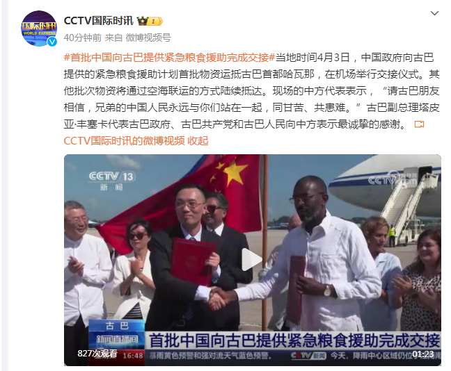 当地时间4月3日,中国政府向古巴提供的紧急粮食援助计划首批物资运抵古巴首都哈瓦那,在机场举行交接仪式。其他批次物资将通过空海联运的方式陆续抵达。现场的中方代表表示,“请古巴朋友相信,兄弟的中国人民永远与你们站在一起,同甘苦、共患难。”古巴副总理塔皮亚·丰塞卡代表古巴政府、古巴共产党和古巴人民向中方表示最诚挚的感谢。