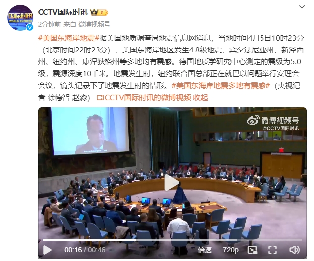据美国地质调查局地震信息网消息,当地时间4月5日10时23分(北京时间22时23分),美国东海岸地区发生4.8级地震,宾夕法尼亚州、新泽西州、纽约州、康涅狄格州等多地均有震感。德国地质学研究中心测定的震级为5.0级,震源深度10千米。地震发生时,纽约联合国总部正在就巴以问题举行安理会会议,镜头记录下了地震发生时的情形。(央视记者 徐德智 赵淼)