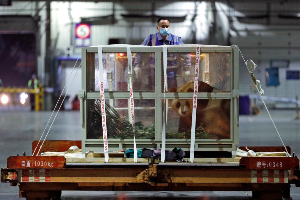 4月3日晚,旅韩大熊猫“福宝”搭乘专机抵达中国成都双流国际机场后,乘车前往中国大熊猫保护研究中心神树坪基地进行隔离检疫。新华社记者沈伯韩 摄