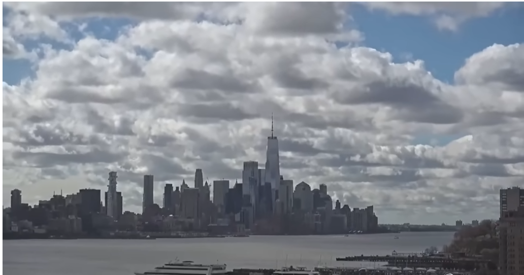 《纽约邮报》称,自由女神像上两个拍摄纽约港全景图像的摄像头在地震时摇摆不定,镜头中的远端是世界贸易中心1号楼。图自《纽约邮报》视频截图