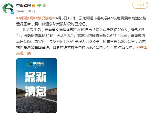 据@中国路网消息,4月6日18时,云南昭通市鲁甸县4.9级地震震中高速公路运行正常,震中普通公路受损路段均已抢通。