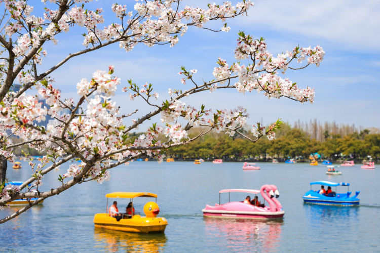 游人在南京玄武湖公园乘坐游船赏花游玩。新华社发(苏阳摄)