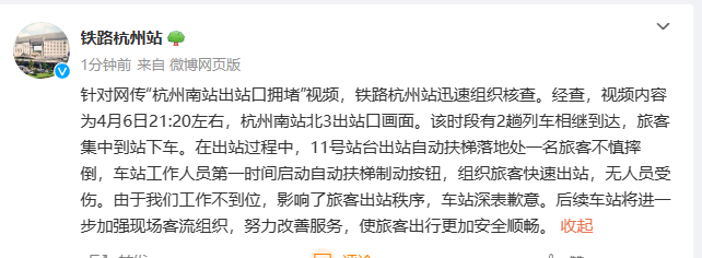刚刚,铁路杭州站官方发布通告回应:针对网传“杭州南站出站口拥堵”视频,铁路杭州站迅速组织核查。经查,视频内容为4月6日21:20左右,杭州南站北3出站口画面。该时段有2趟列车相继到达,旅客集中到站下车。在出站过程中,11号站台出站自动扶梯落地处一名旅客不慎摔倒,车站工作人员第一时间启动自动扶梯制动按钮,组织旅客快速出站,无人员受伤。由于我们工作不到位,影响了旅客出站秩序,车站深表歉意。后续车站将进一步加强现场客流组织,努力改善服务,使旅客出行更加安全顺畅。