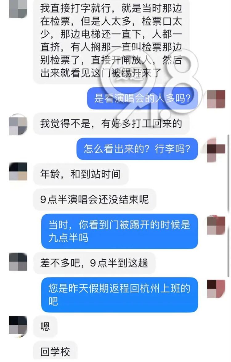 “当时是返程高峰,我们出站的时候都要检票,现场检票出站的人太多了,检票口少,而电梯还在不断地运转输向下出站的旅客,我听到有人大喊别检票了,直接出开闸放人吧,出来后就看到这个门被踢开了!”小童描述。