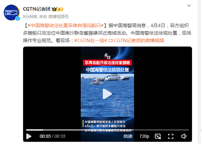 据中国海警局消息,4月4日,菲方组织多艘船只非法位中国南沙群岛鲎藤礁邻近海域活动。中国海警依法依规处置,现场操作专业规范。看现场↓