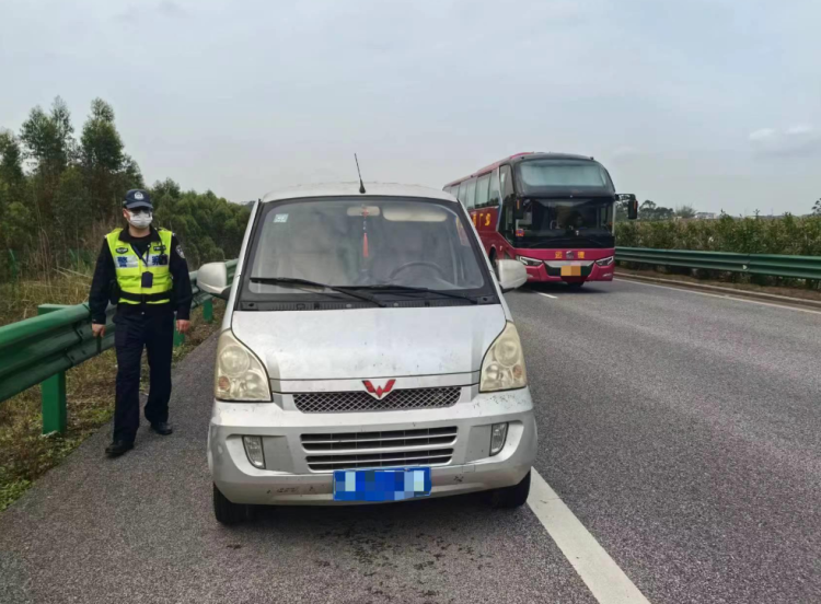 近日,广西壮族自治区公安厅交警总队高速公路管理支队四大队执勤民警巡逻至S40贵隆高速贵港方向233km处时,发现一辆小型面包车打着双闪灯低速行驶。民警猜测车辆可能发生了故障,出于安全考虑,便驾驶警车跟随其后。