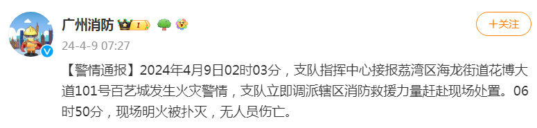 【警情通报】2024年4月9日02时03分,支队指挥中心接报荔湾区海龙街道花博大道101号百艺城发生火灾警情,支队立即调派辖区消防救援力量赶赴现场处置。06时50分,现场明火被扑灭,无人员伤亡。