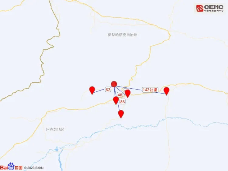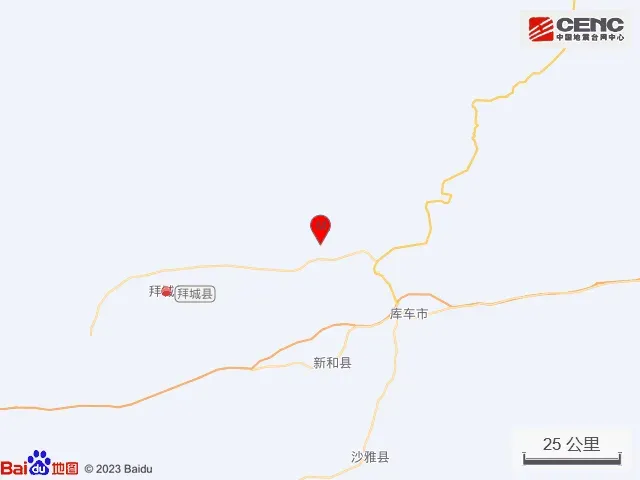 周边县城: 震中距库车市47公里、距新和县48公里、距拜城县62公里、距沙雅县86公里、距轮台县142公里,距阿拉尔市192公里,距乌鲁木齐市460公里。