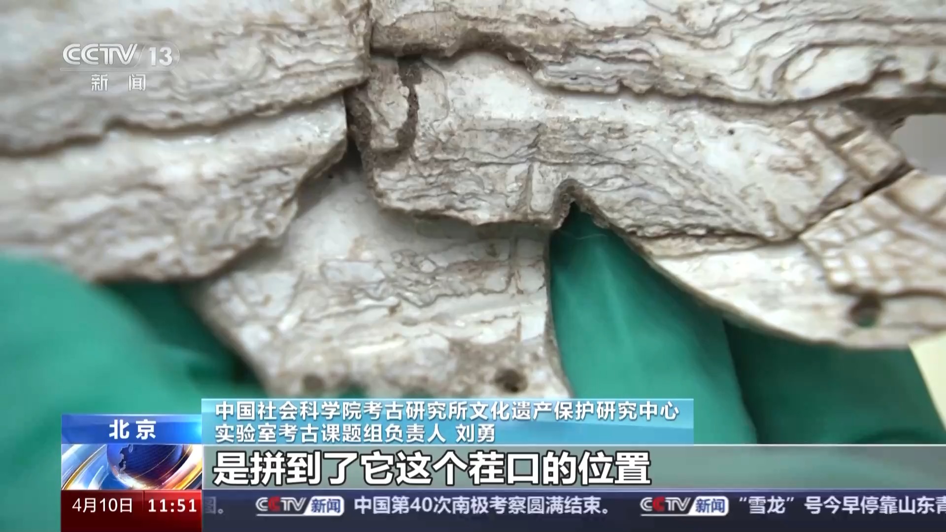 刘勇:我们在3D模拟的时候,是拼到了它这个茬口的位置,后来我们手动拼了之后,就发现它身上有一道从上往下的划痕,刚好就和它能对上。当时一下子豁然开朗,所以这样就是两个证据,同时确定了它的前腿的位置。而且我们翻过来一看,和整个蚌饰的纹理的走向都能对上,所以后来我们就确认,这是一个有足的、有腿的龙。