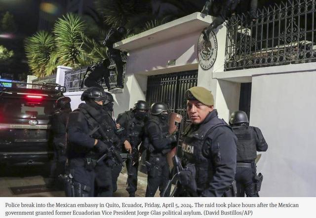 据卡塔尔半岛电视台4月9日报道,墨西哥外交部当天公布了厄瓜多尔警方突袭墨西哥驻厄大使馆的现场视频,称其为“未经授权的暴力闯入”。当时,身处使馆内的厄瓜多尔前副总统格拉斯被逮捕,此事件导致墨西哥中止了两国外交关系。