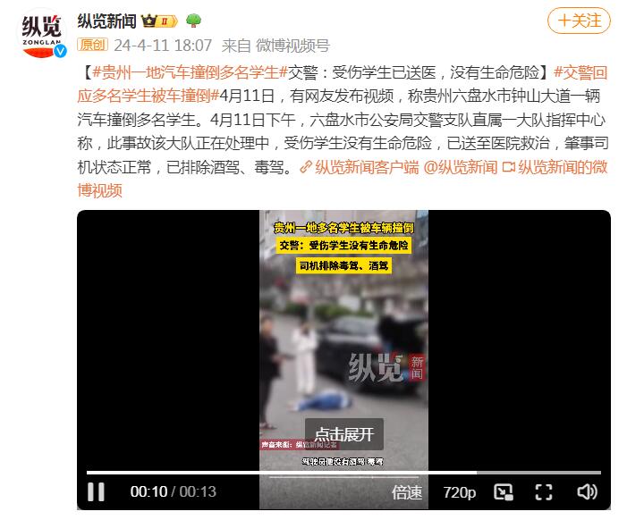 4月11日,有网友发布视频,称贵州六盘水市钟山大道一辆汽车撞倒多名学生。4月11日下午,六盘水市公安局交警支队直属一大队指挥中心称,此事故该大队正在处理中,受伤学生没有生命危险,已送至医院救治,肇事司机状态正常,已排除酒驾、毒驾。