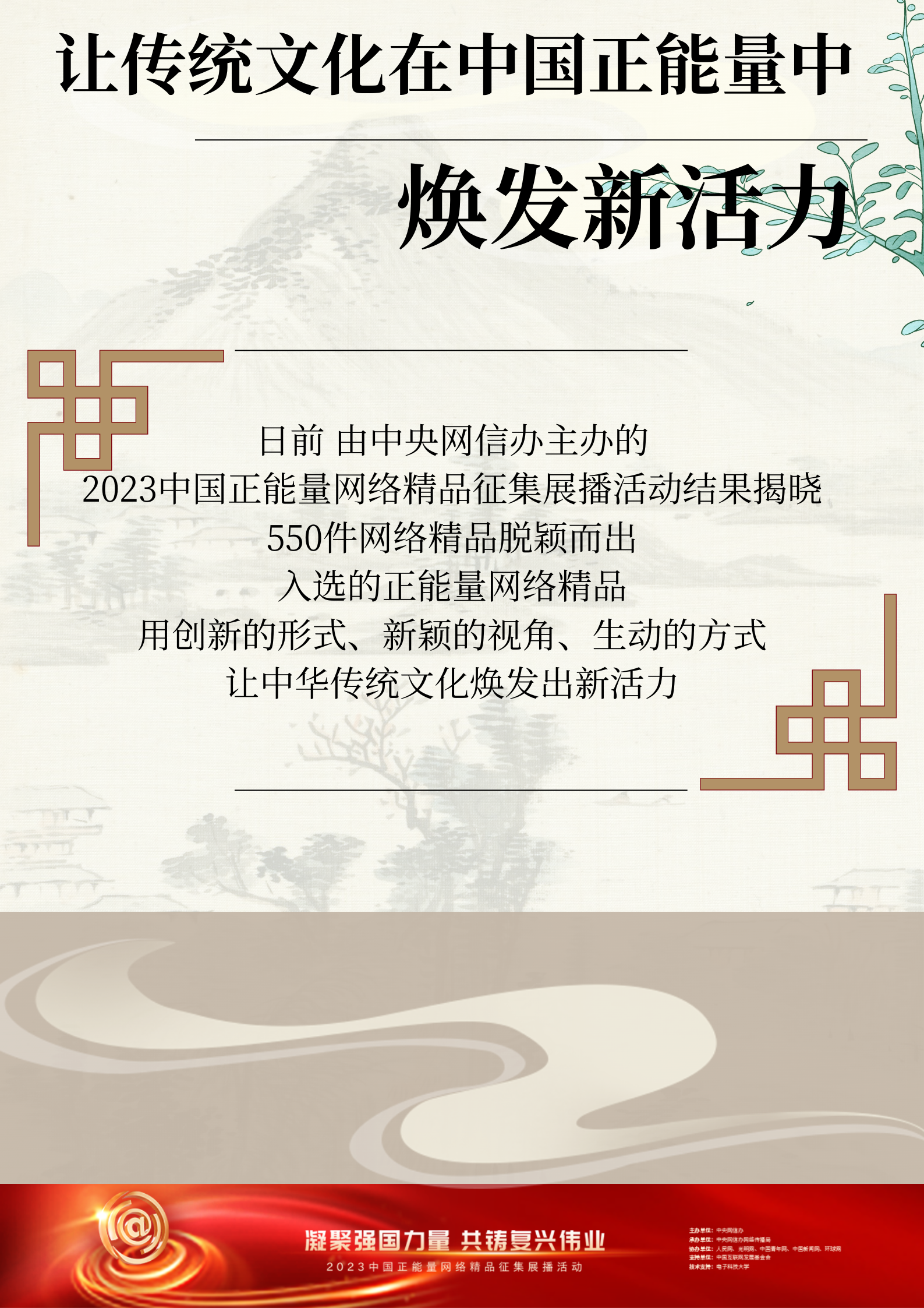 日前,由中央网信办主办的2023中国正能量网络精品征集展播活动结果揭晓,550件网络精品脱颖而出。入选的正能量网络精品,用创新的形式、新颖的视角、生动的方式,让中华传统文化焕发出新活力。策划:黄丹琳制作:田佳南