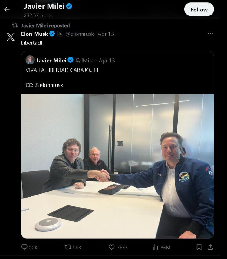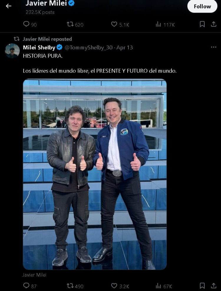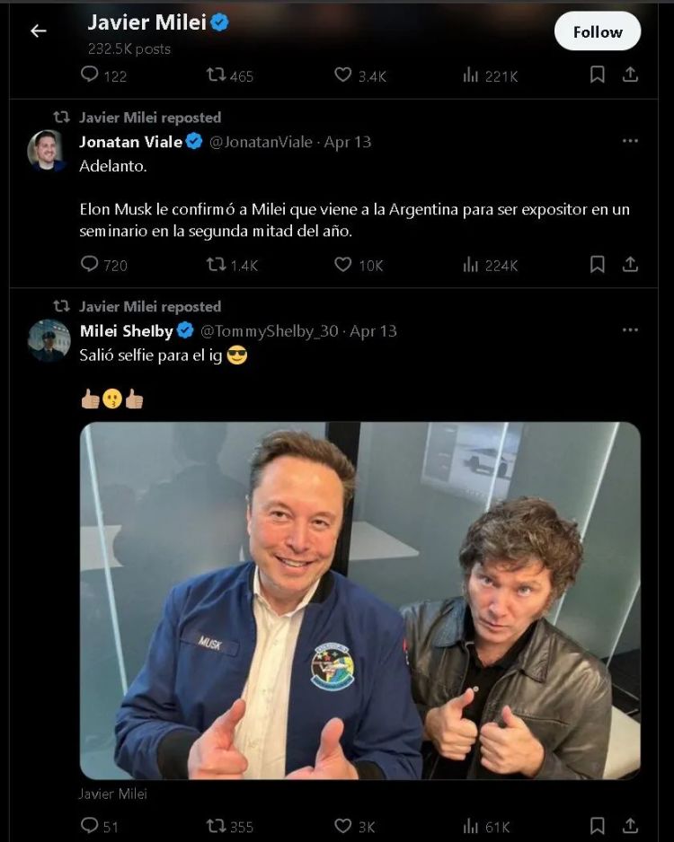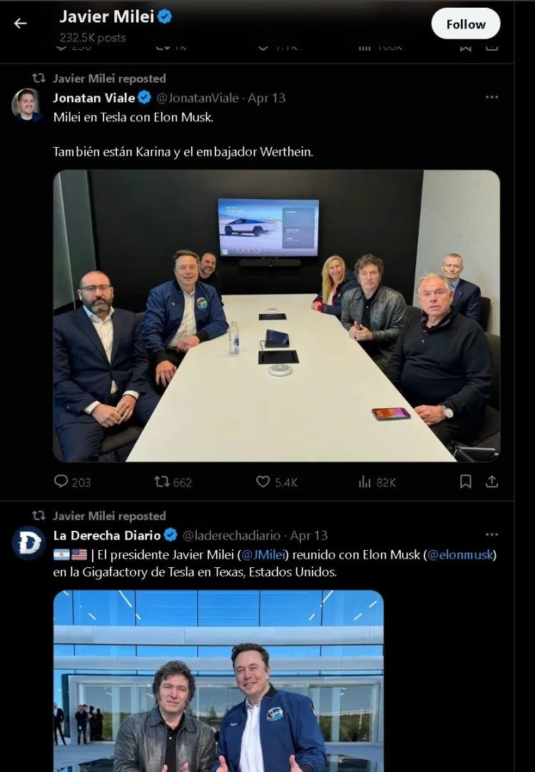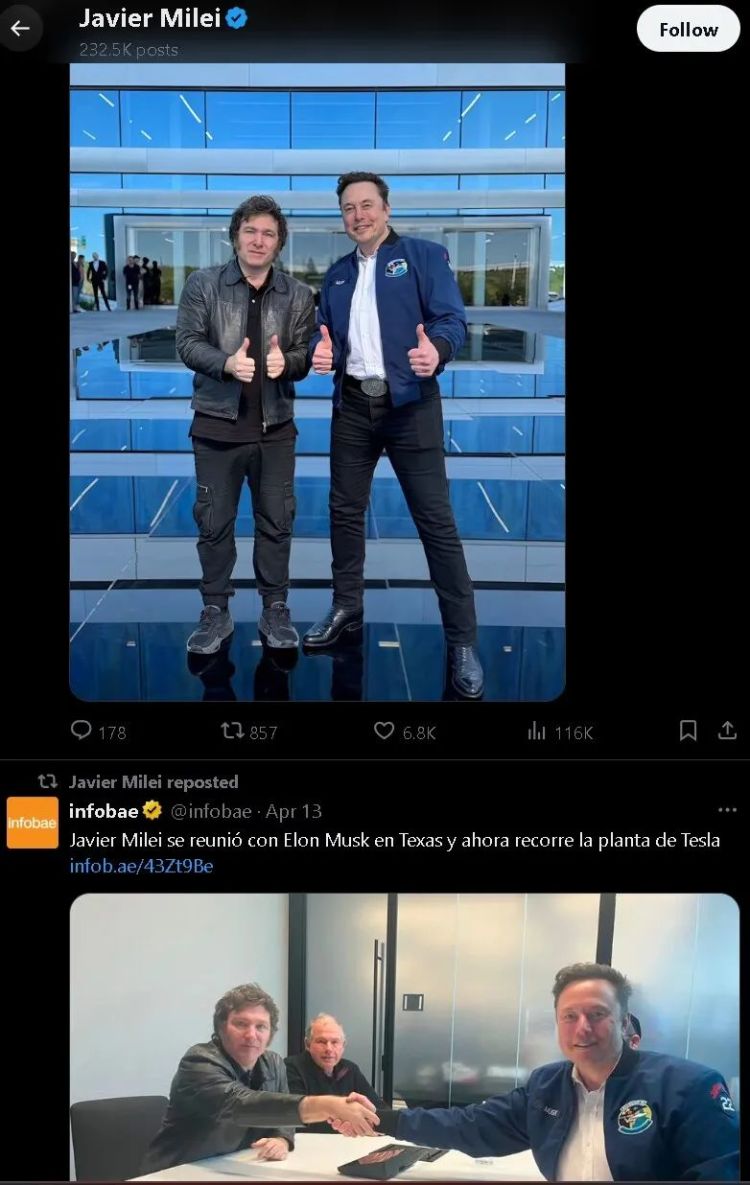 然而,从当天米莱发布的其他后续网帖来看,他似乎并不为与女友分手感到伤感,因为他后续的帖文几乎都被他与美国特斯拉公司的老板埃隆·马斯克的合影“刷屏”了。实际上,从他宣布与女友分手,到他在对伊朗对以色列发动的空袭做出表态之间,他发布和转发的绝大多数帖文内容都是他和马斯克的会见与合影。
