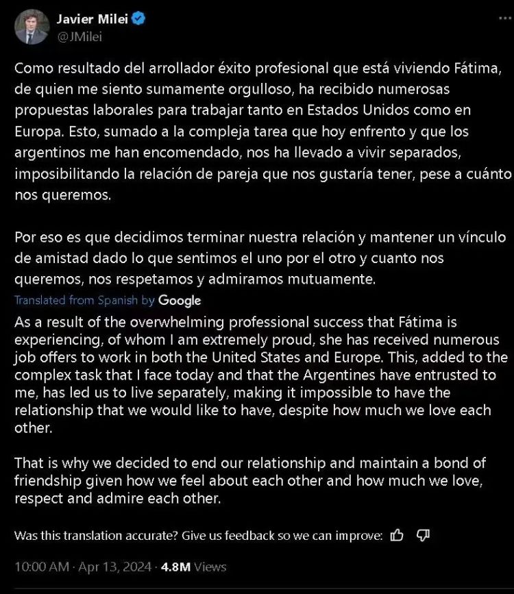 从外媒的报道来看, 米莱之所以和他“身材火辣”的喜剧演员女友法蒂玛·弗洛雷斯(Fátima Flórez)分手,是因为两人“在行程上的冲突”。