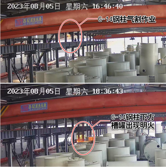 18时36分许,正在车间内查看施工情况的熊某华发现位于厂房东北向西南方向数第2列(G轴)、西北向东南方向数第14根(G-14)钢柱北侧下方的PPR槽料罐内着火。