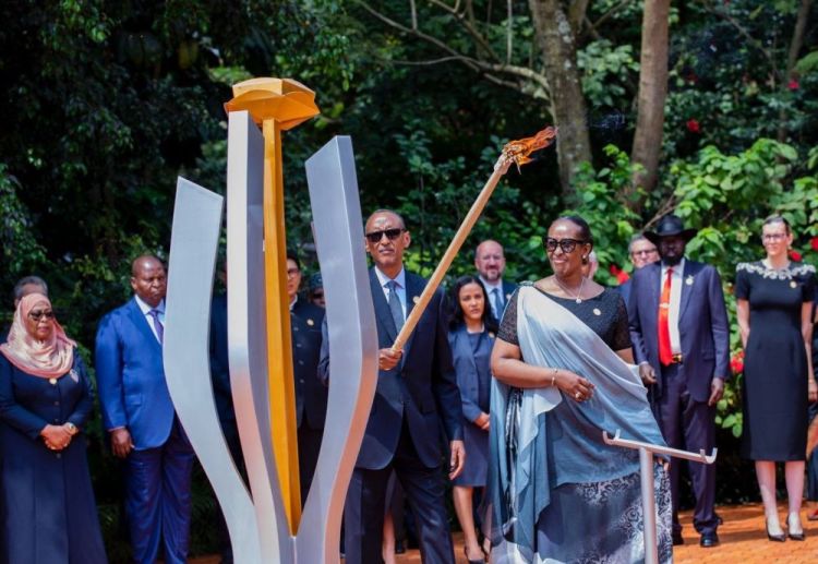 新华社基加利4月17日电 4月7日,在卢旺达首都基加利的基加利大屠杀纪念馆,卢旺达总统保罗·卡加梅与出席纪念活动的各国政要向大屠杀遇难者敬献花圈,随后共同点燃纪念火炬。