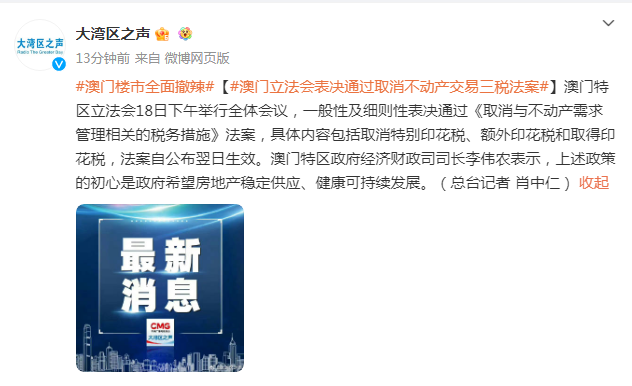 澳门特区立法会18日下午举行全体会议,一般性及细则性表决通过《取消与不动产需求管理相关的税务措施》法案,具体内容包括取消特别印花税、额外印花税和取得印花税,法案自公布翌日生效。澳门特区政府经济财政司司长李伟农表示,上述政策的初心是政府希望房地产稳定供应、健康可持续发展。(总台记者 肖中仁)