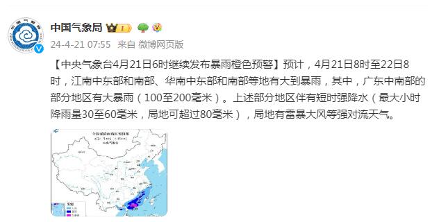 预计,4月21日8时至22日8时,江南中东部和南部、华南中东部和南部等地有大到暴雨,其中,广东中南部的部分地区有大暴雨(100至200毫米)。上述部分地区伴有短时强降水(最大小时降雨量30至60毫米,局地可超过80毫米),局地有雷暴大风等强对流天气。